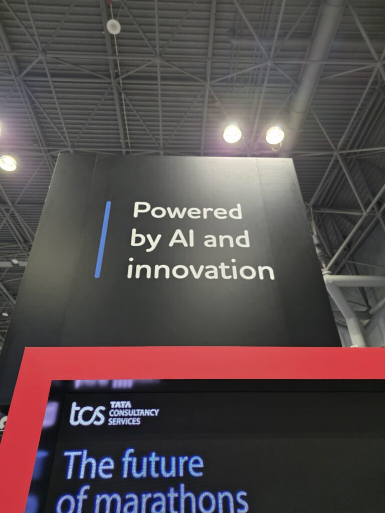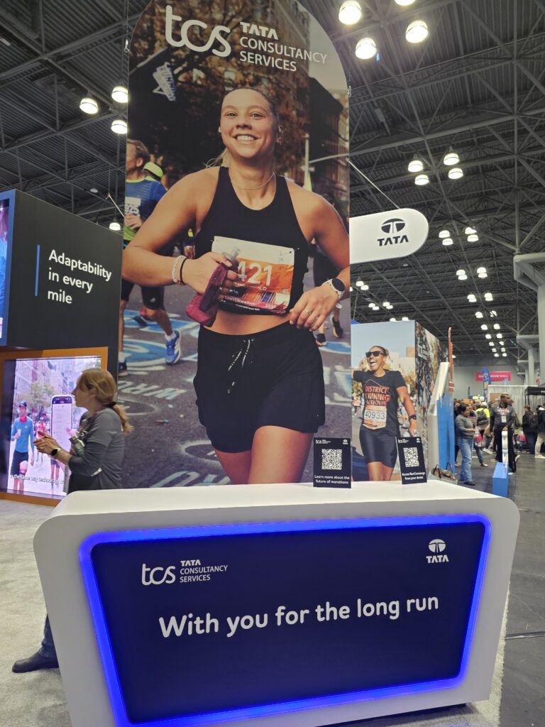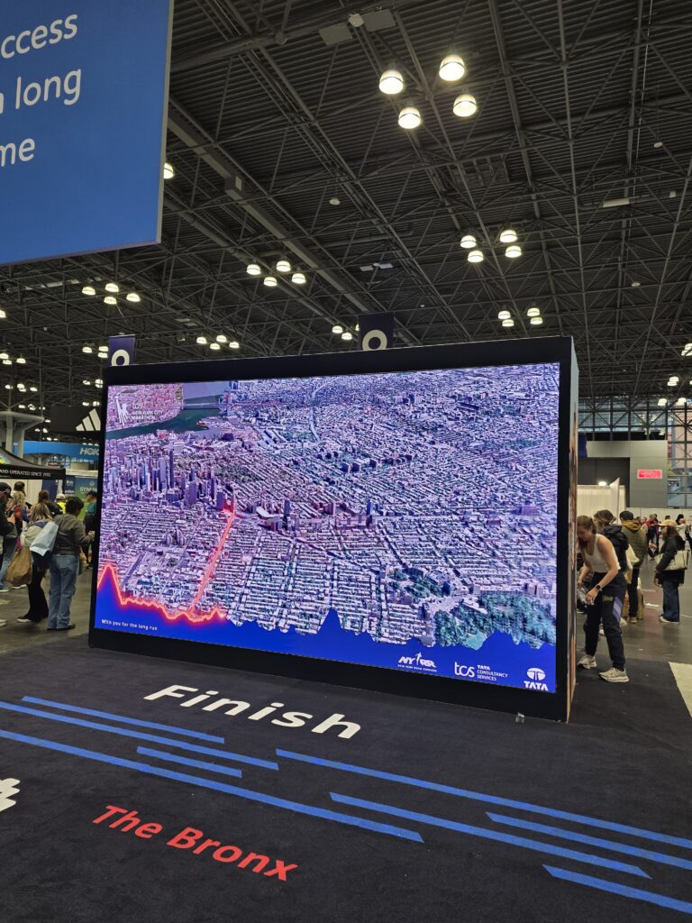 目に飛び込むのが、冠スポンサーであるTCS(タタ・コンサルタンシー・サービシズ)の巨大スクリーンだ。マンハッタンのコース全景が3Dで表示され、その横ではAIチャットが「あなたのスタートウェーブ」「レース当日の詳細な天候予測」「おすすめの応援スポット」をパーソナライズドして教えてくれる。