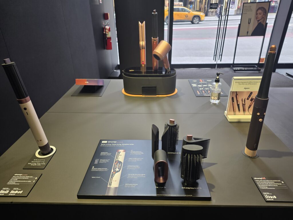 この店舗のUXデザインの頂点が、奥に位置するヘアケアゾーンだ。 ここでは、単なる製品の陳列は行われない。鏡面仕上げのカウンターに、Supersonic(ドライヤー)、Airwrap(スタイラー)、Corrale(ストレートアイロン)の実機が並ぶ。