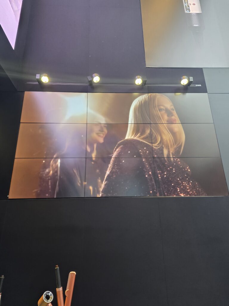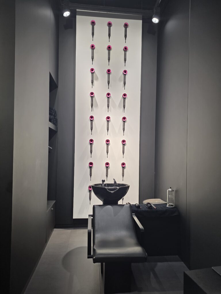 ヘアケアゾーンの設計は、その典型だ。 鏡面カウンターは、製品と自分の顔が同時に美しくフレームに収まるように角度が計算されている。照明は、肌の色を健康的に見せつつ、Airwrapで巻かれた髪の「天使の輪(ツヤ)」が最も際立つ色温度と光量に調整されている。 黒を基調としたミニマルな壁面は、カラフルなSupersonicやAirwrapの限定色(例:ヴィンカブルー&ローズ)を際立たせる完璧な背景となる。