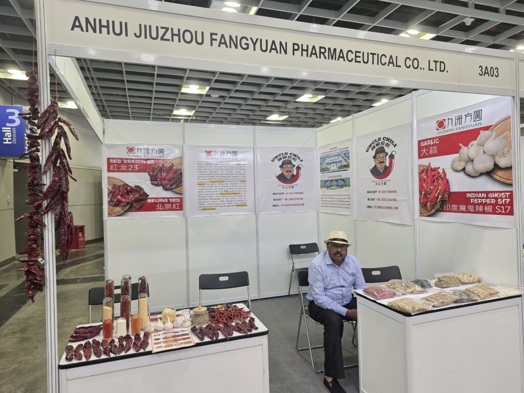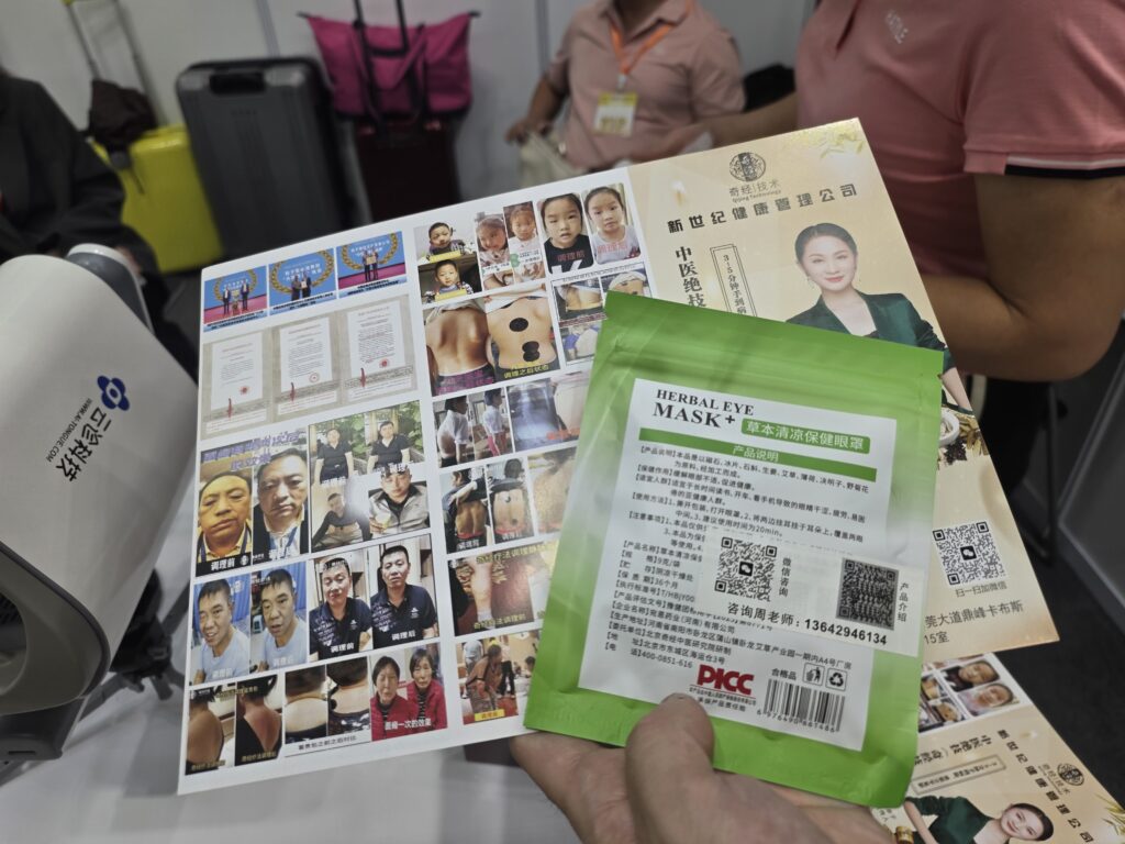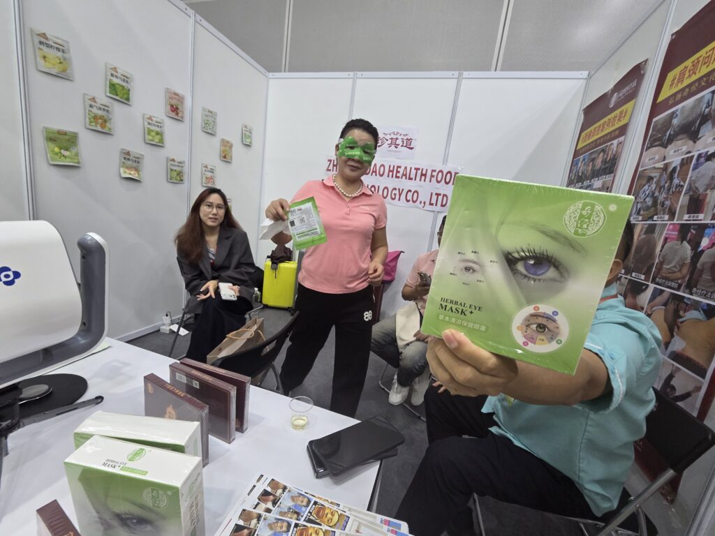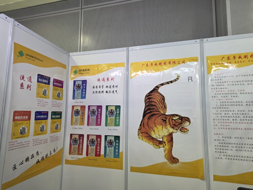 このブースは、広東省の中医薬メーカーによる外用鎮痛パッチ(膏薬)シリーズの展示で、伝統医学の概念である“活血化瘀”や“祛風湿”に基づく貼付剤をサイズ・用途別に数十種並べている。虎のシンボルは、筋骨強化や通絡作用を象徴する中医薬文化の定番モチーフであり、ブランドの歴史性と効能イメージを視覚的に訴求する役割を持つ。外用貼付剤は国際規制が比較的緩いため、中国・東南アジア・中東・アフリカで広く輸出される“グローバル中医薬”の代表的カテゴリであり、展示会でも最もバイヤーが集まりやすい商品群となっている。