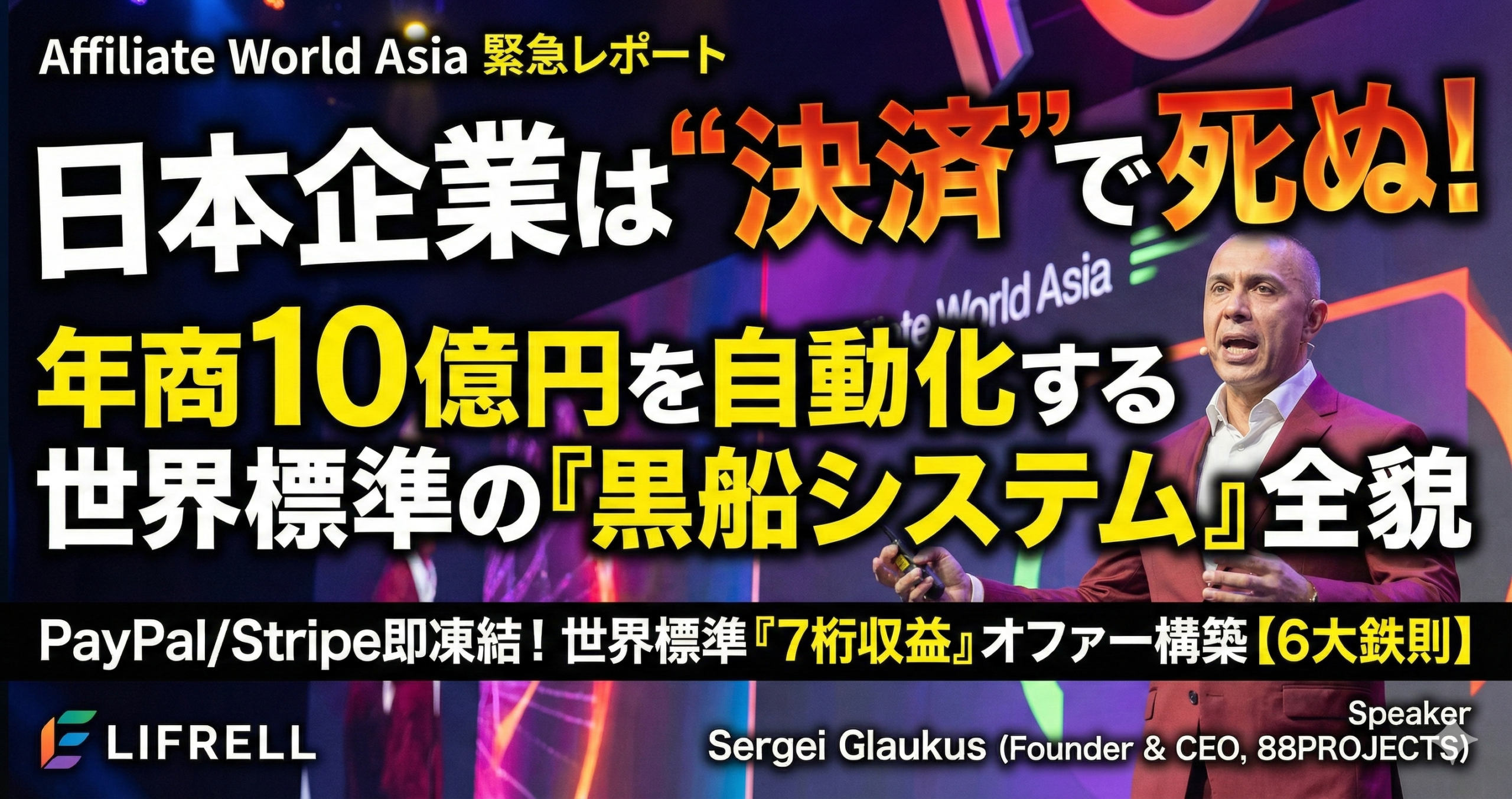 タイ・バンコクで開催されたAffiliate World Asia (AWA)は、世界中のキャッシュフローを支配するマーケティングシステムが集結する、まさに「富の交差点」でした。ここで88PROJECTSのSergei Glaukus氏が公開したセッション「How to create your own 7-figure nutra offer, at no cost and with 0 experience」の衝撃は、日本の経営者層に今すぐ届かなければなりません。