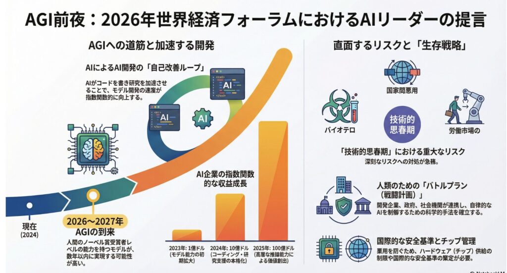 本記事は、世界経済フォーラム年次総会2026の公式セッション「The Day After AGI」を対象に、公開映像およびユーザー提供の文字起こし・要約素材(Gemini生成を含む)をもとに、編集部で再構成・加筆したものです。