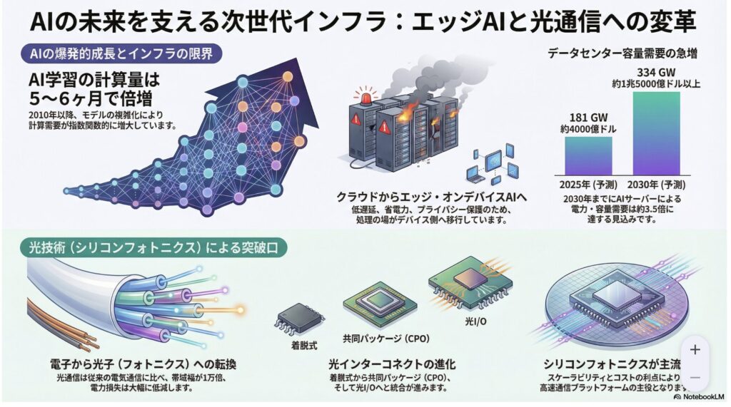 「電子の壁」を突破する唯一の解は、情報の運び役を「電子」から**「光子(フォトン)」**に変えることです。光には「熱を持たない」「長距離でも劣化しない」「極めて速い」という特性があります。