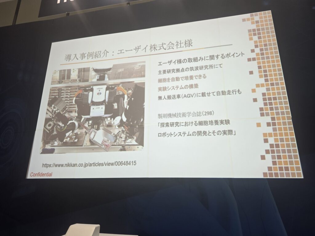 - 医薬品業界(エーザイ、武州製薬):切実な人手不足の現場へ 非常に興味深かったのは、医薬品業界での事例だ。エーザイでは、研究開発の現場で、ロボットがひたすら実験を繰り返していた。 「人間がやるとどうしてもバラつきが出ますし、土日に実験のために呼び出されたりするとブラックになってしまう。ロボットなら安定した品質で、24時間実験を続けられます」 また、ジェネリック医薬品受託製造の武州製薬の事例は、日本の製造業が抱える危機感を象徴していた。 「地域の工場では、もう人が集まらないんです。人手による作業をなんとかロボットに置き換えたい。その切実な思いで導入を決断されました。最近は、『多少コストがかかってもいい、今ロボットの面倒を見られる人材がいるうちに導入を始めないと、5年後、10年後に事業が継続できない』という強い危機感を持った企業が増えています」
