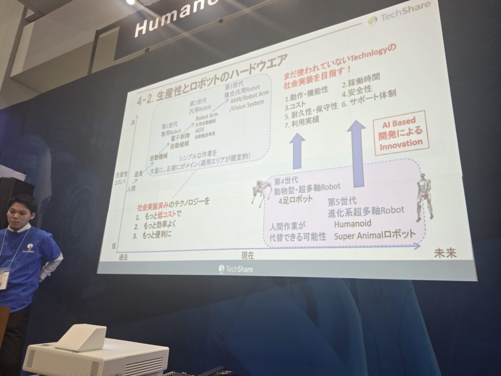 「TeslaのOptimusなどは非常に有名ですが、『いつ買えるのか?』という話になると、2025年、26年、あるいは27年……と、まだ先の話が多いのが現状です。それらは、ある程度特定の用途向けに完成されたソリューションとして提供されることを目指しています」