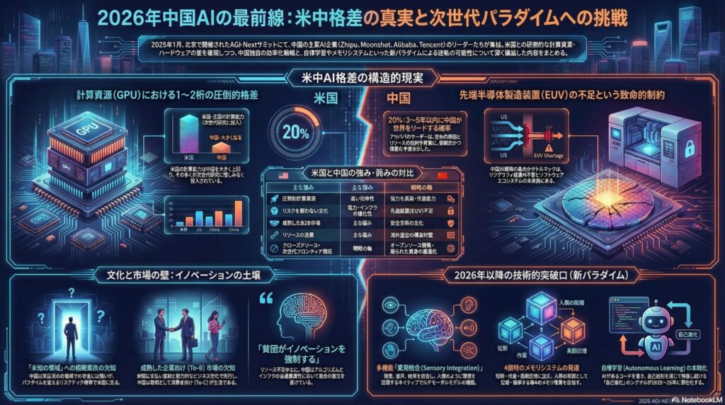 2026年、AIの戦場は「モデルの大きさ」から「パラダイムの転換」へと移ります。 中国のリーダーたちが抱く「米国への敗北感」から生まれる、地を這うような執念。そして「知能を民主化する」という強い社会的使命。それこそが、次の「知能の朝」を北京で迎えるための原動力となっています。
