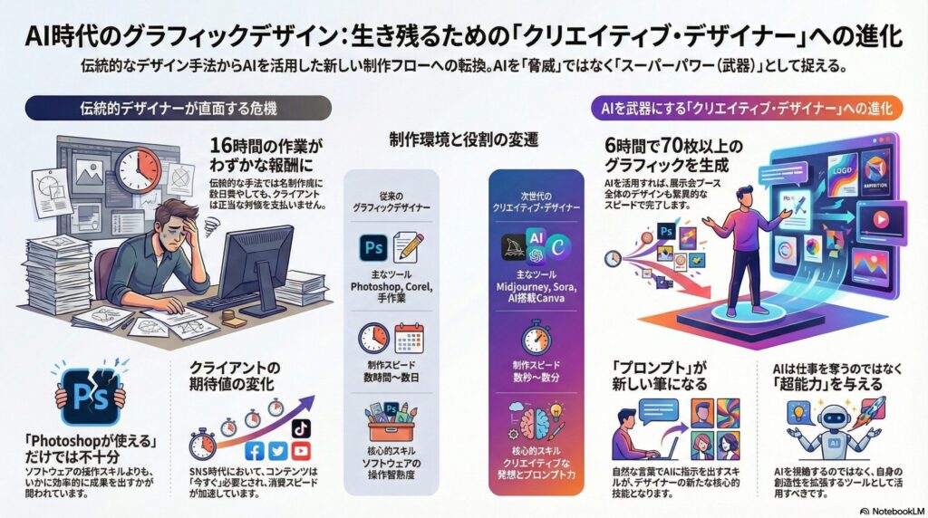 これからのクリエイティブの「基本」は、AIを利用することです。 「グラフィックを勉強するなら、周りの環境を見て、トップ企業がどの程度進んでいるかを知り、AIという『思考のプログラム』をどう書くか(プロンプトをどう設計するか)を学ぶべきです。Google、Meta、そして最先端のAIツール……これらを自在に使いこなせない人は、どれほどセンスがあっても、ただの『高コストな部品』として扱われる運命にあります」