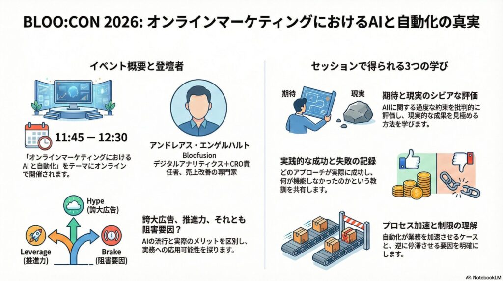 テーマは**「オンラインマーケティングにおけるAIと自動化 – 誇大広告(Hype)、レバー(Lever)、それともハンドブレーキ(Handbrake)?」**。