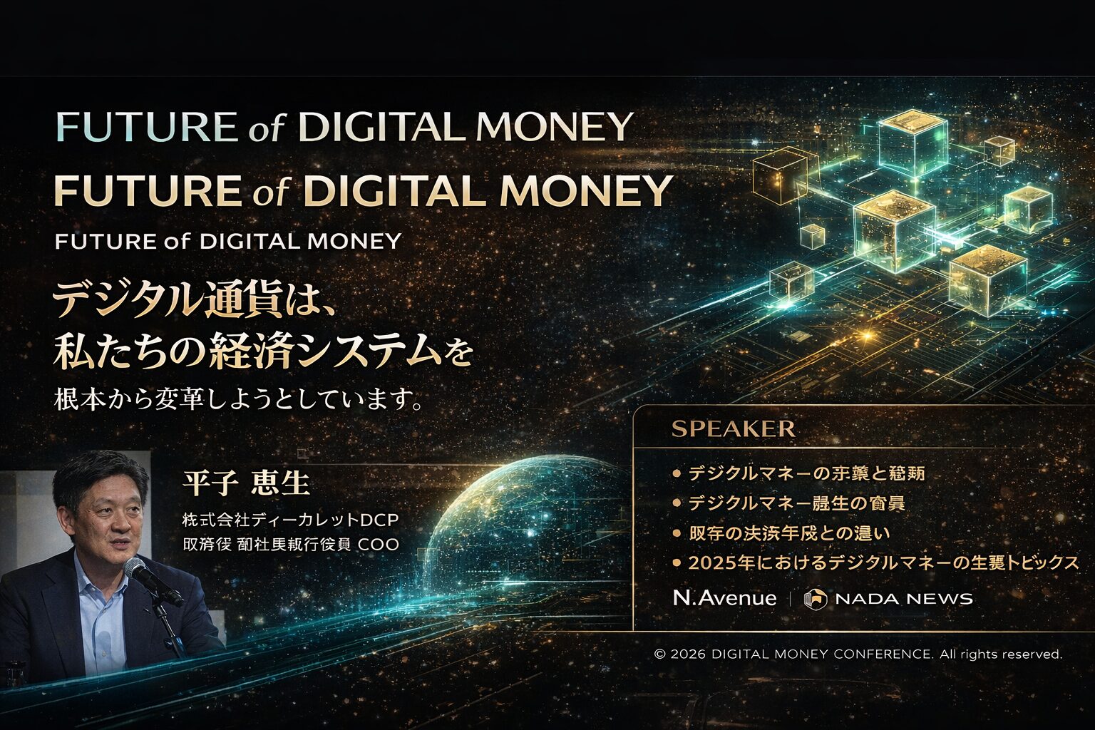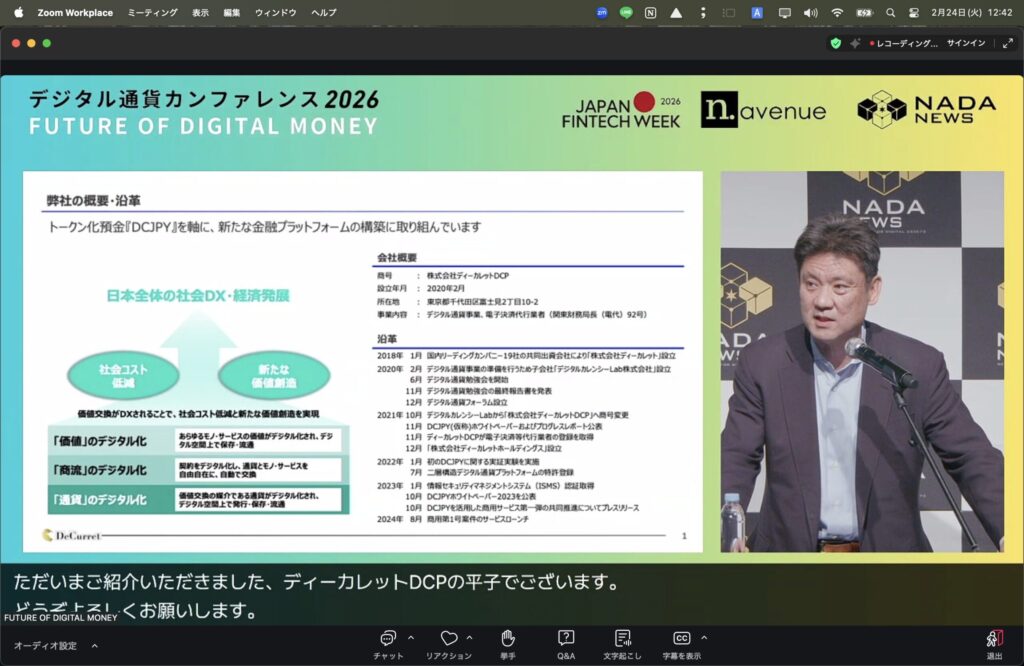 「デジタル通貨カンファレンス 2026 — FUTURE OF DIGITAL MONEY」のオープニングセッションに続くプレゼンテーションの壇上に立ったのは、株式会社ディーカレットDCP 取締役副社長執行役員COOの**平子惠生(Hirako Yoshio)**氏。