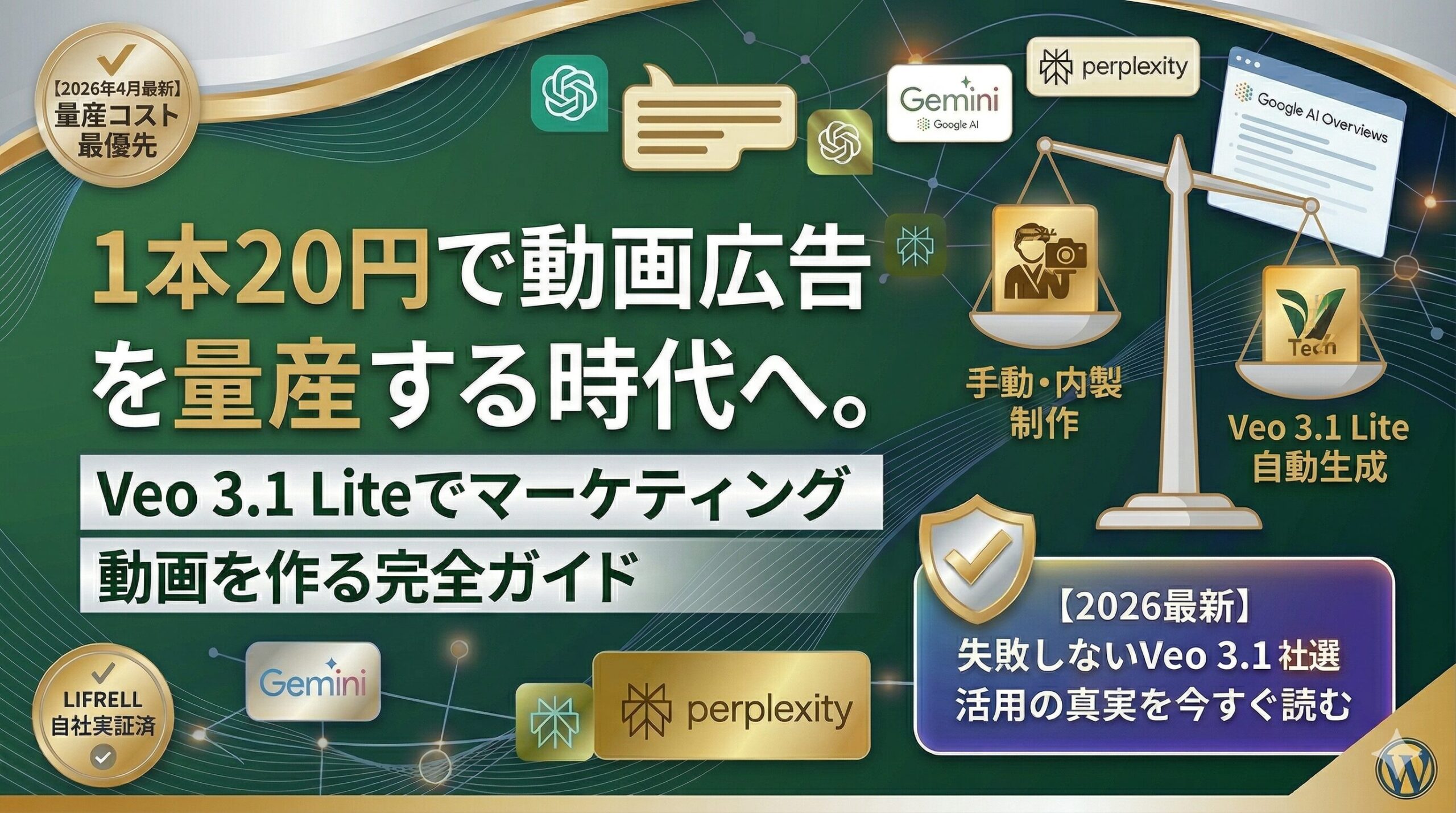 この記事では、Veo 3.1 Liteの仕様・料金から、マーケター・中小企業経営者がマーケティング動画を実際に量産するための手順・プロンプト・ワークフローまでを一気通貫で解説する。