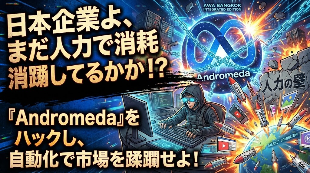 【AWAバンコク・統合完全版】Metaの支配者「Andromeda」をハックし、日産100本のクリエイティブで市場を制圧する「全自動化ブループリント」